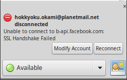 Při připojení pluginu (viz. ZDE) k facebook chatu, hlásí chybu “…facebook.com: SSL Handshake Failed“.