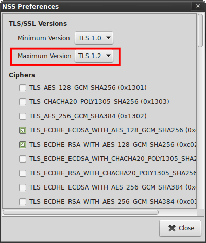 - Dole tlačítko Configure – nahoře v rozbalovací nabídce vyberte Maximum Version TLS / SSL … TLS 1.2